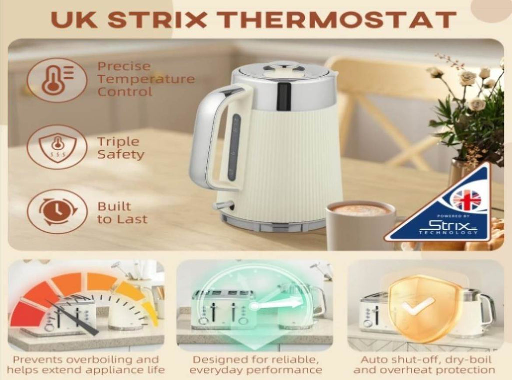 - Kettle with UK Strix thermostat for precise temp control and safety, meanwhile, a cool-touch lower body for safety