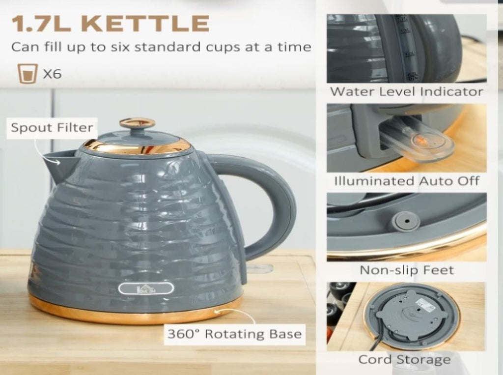- Power: 780-930W (toaster), 2520-3000W (kettle)