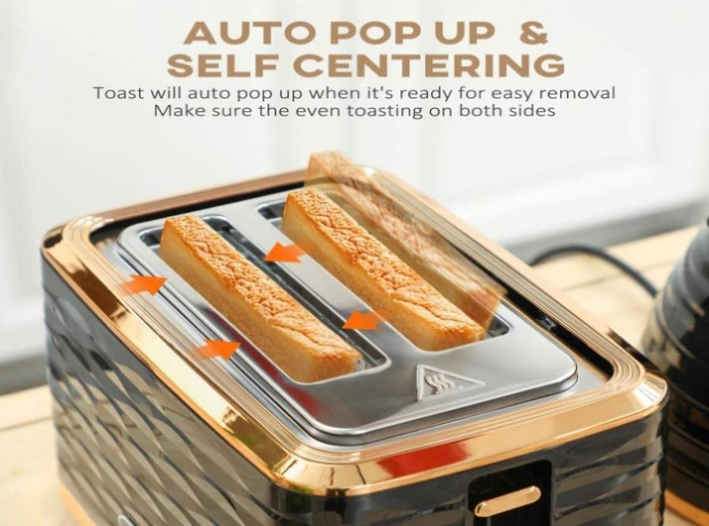 - Auto pop-up and auto-centre option for toast. Crumb tray for easy cleaning