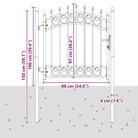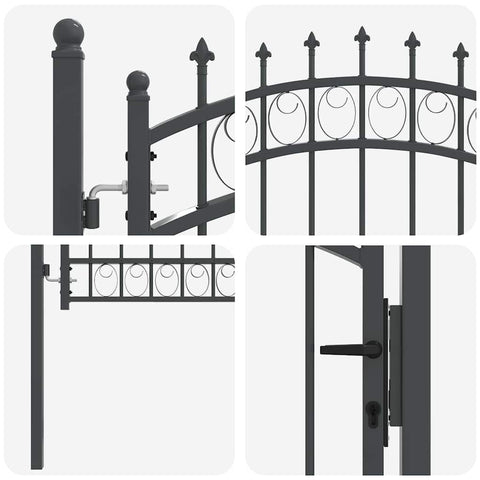 This elegant fence gate adds both functionality and modern aesthetics to any outdoor space. Tailor-made for garden and terrace areas, it combines a timeless design with security. Constructed from durable powder-coated steel, this Rectangular gate is not only robust and weather-resistant but also aesthetically pleasing, enhancing the overall look of your premises. The arched top design with its sleek spikes provides a statement of style, while maintaining the necessary safety and division in your garden. Powder-Coated Steel: Built with high-quality powder-coated steel, the gate withstands various weather conditions, ensuring longevity and minimal maintenance. The durable finish prevents ,bumps, or scratches, making it perfect for continuous outdoor exposure. Secure Deadbolt Locks: Featuring deadbolt locks, this gate offers heightened security, ensuring your garden remains safe from unwanted access. The locks are robust, requiring a key for operation, which gives you peace of mind in knowing your outdoor space is secured. Arched Top Design: The elegant arched top enhances your garden’s visual appeal. This design, coupled with decorative spikes, adds a modern touch to any landscape, creating an inviting entrance that is both functional and stylish. Complete Set: Delivered with everything needed, including two sturdy posts, strong hinges, and three matching keys. This complete set simplifies assembly and assures stability upon installation, allowing you to achieve the finish you desire quickly and effectively. Care &Maintenance: Easy to maintain, this gate only requires an occasional wipe with a damp cloth, keeping it looking pristine and fresh, without the need for rigorous care routines. Such low maintenance supports long-lasting aesthetics and function.