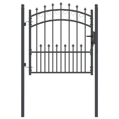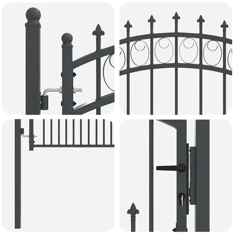 This fence gate with spikes embodies modern simplicity, featuring a sleek, powder-coated steel structure characterized by clean lines and minimal ornamentation. Designed explicitly for outdoor settings such as gardens and terraces, it offers an impressive combination of style and practicality. Its arched top design adds a touch of elegance, making it not just a piece of functional hardware, but also an aesthetically appealing feature for outdoor spaces. The robust construction ensures reliable performance in various weather conditions while offering a secure boundary solution. Powder-Coated Steel: The gate is made from high-quality powder-coated steel, recognized for its long-lasting durability and resilience against outdoor elements. This finish not only provides an extra layer of protection against and but also ensures the gate maintains its visual appeal over time. The robustness of the material means less maintenance, making it ideal for those who seek both beauty and practicality in an outdoor gate. Included Components: Complete with two fence posts and sturdy hinges for easy installation, this gate comes equipped with three matching keys. The components have been carefully chosen to ensure secure and reliable operation, giving peace of mind whether for personal residences or more community-focused settings. The seamless integration of these components underscores the gate's overall functional design. Stylish Arched Design: Featuring an elegant arched top and decorative spikes, this gate complements a wide array of garden styles. The design mimics classic elegance while providing a modern twist, enhancing the aesthetic value of any outdoor area. It seamlessly blends into the natural beauty of garden settings, turning a simple barrier into a stylish accent. Outdoor Versatility: Perfectly suited for gardens and terraced spaces, the gate's design offers both privacy and delineation of spaces. Its modern look seamlessly integrates with contemporary outdoor environments, making it a versatile addition that suits various landscape designs. It creates a welcoming entrance while maintaining the privacy you desire. Assembly and Maintenance: Assembly requires two individuals and a screwdriver for quick setup. The components ensure stability and safety once installed. For maintenance, regular checks of hinges and bolts are recommended to ensure longevity. Cleaning the surface with a mild detergent and water will keep the gate looking as good as new while extending its operational life.