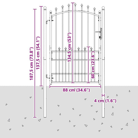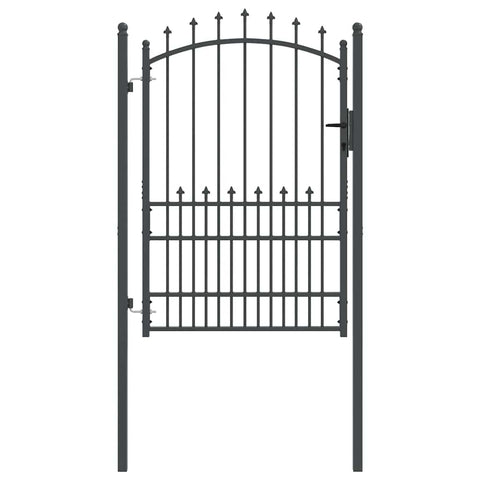 The Modern Fence Gate with Spikes brings a contemporary edge to any outdoor setting. This rectangular gate, characterized by clean lines and an unobtrusive style, offers both aesthetic value and functionality. Powder-coated steel ensures it stands robust against elements, making it perfect for gardens or terraces. Material Quality: Constructed with powder-coated steel, ensuring resilience against and weather. This material choice provides a smooth finish that complements modern aesthetics while offering long-term durability. Its inherent strength guarantees that your outdoor space remains secure across all seasons, with minimal maintenance required to retain its pristine look. Robust Locks: Featuring deadbolt locks, the gate enhances security, preventing unauthorized access. Known for strength, these locks are key-operated, making them ideal for heavier gate structures. This crucial component assures peace of mind, as your garden and terrace stay protected even when not in sight, with three matching keys included. Architectural Style: An arched top combines with sleek spikes, delivering a stylish barrier that adorns your property. This artistic design element not only elevates the visual appeal but also adds a layer of deterrence against climbing. The balance between form and function makes it suitable for diverse outdoor ambiances. Complete Package: Delivered with two sturdy posts and hinges, this kit simplifies installation. Practical assembly requirements ensure that you achieve a cohesive look in your exterior space. Designed for ease and longevity, the components collectively provide seamless operation and structural integrity. Maintenance Guidelines: Maintain its elegance by simply wiping with a damp cloth. This straightforward care routine ensures that the gate remains as appealing as the day it was installed, with minimal effort invested.