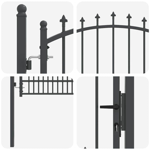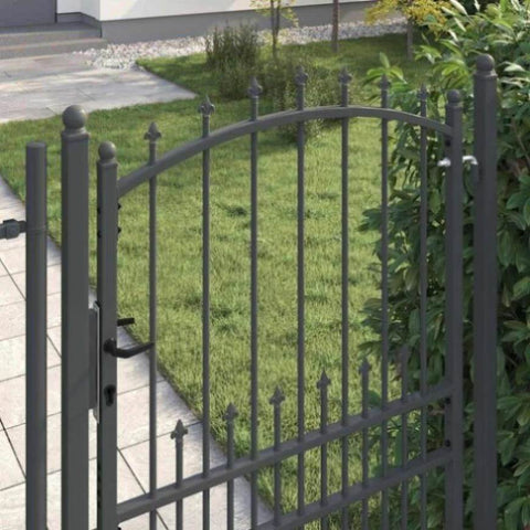 The Modern Fence Gate with Spikes brings a contemporary edge to any outdoor setting. This rectangular gate, characterized by clean lines and an unobtrusive style, offers both aesthetic value and functionality. Powder-coated steel ensures it stands robust against elements, making it perfect for gardens or terraces. Material Quality: Constructed with powder-coated steel, ensuring resilience against and weather. This material choice provides a smooth finish that complements modern aesthetics while offering long-term durability. Its inherent strength guarantees that your outdoor space remains secure across all seasons, with minimal maintenance required to retain its pristine look. Robust Locks: Featuring deadbolt locks, the gate enhances security, preventing unauthorized access. Known for strength, these locks are key-operated, making them ideal for heavier gate structures. This crucial component assures peace of mind, as your garden and terrace stay protected even when not in sight, with three matching keys included. Architectural Style: An arched top combines with sleek spikes, delivering a stylish barrier that adorns your property. This artistic design element not only elevates the visual appeal but also adds a layer of deterrence against climbing. The balance between form and function makes it suitable for diverse outdoor ambiances. Complete Package: Delivered with two sturdy posts and hinges, this kit simplifies installation. Practical assembly requirements ensure that you achieve a cohesive look in your exterior space. Designed for ease and longevity, the components collectively provide seamless operation and structural integrity. Maintenance Guidelines: Maintain its elegance by simply wiping with a damp cloth. This straightforward care routine ensures that the gate remains as appealing as the day it was installed, with minimal effort invested.