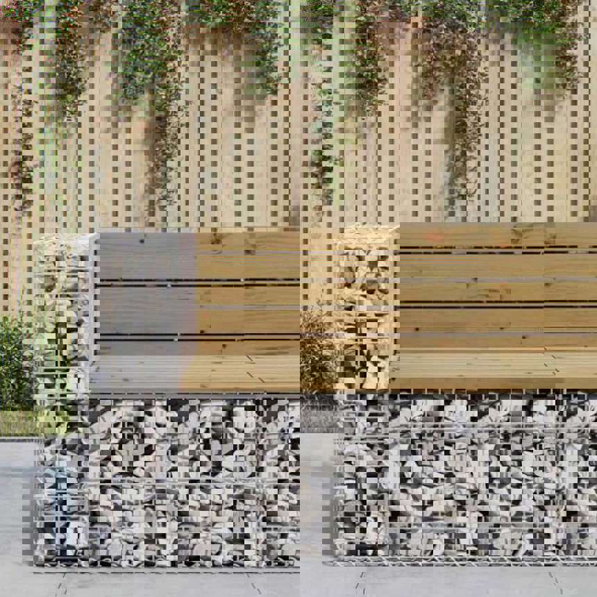 Create your own outdoor seating space with this garden bench! This garden bench will be a real eye-catcher in your outdoor living space. Impregnated wood: This top of the garden seat is made of vacuum pressure impregnated pinewood for durability. Solid pine wood is a beautiful natural material. It has a straight grain, and the knots give the material its signature, rustic look. Impregnation is a preservation process that is carried out by using autoclaves. The pressure-treatment increases resistance to decay and weather.Sturdy and stable base: This outdoor bench features a galvanised steel gabion basket base that is designed to be filled with rocks and gravels for additional beauty. The mesh grid of gabion basket is welded with transverse and longitudinal wires at every intersection for extra stability.Compact design: This garden bench seat is perfect for a limited space thanks to its narrow and compact design.Wide range of uses: This park bench is suitable for gardens, backyards, patio spaces, secret corner locations and more. Good to know:To make sure your outdoor furniture stays beautiful, we recommend protecting it with a waterproof cover.