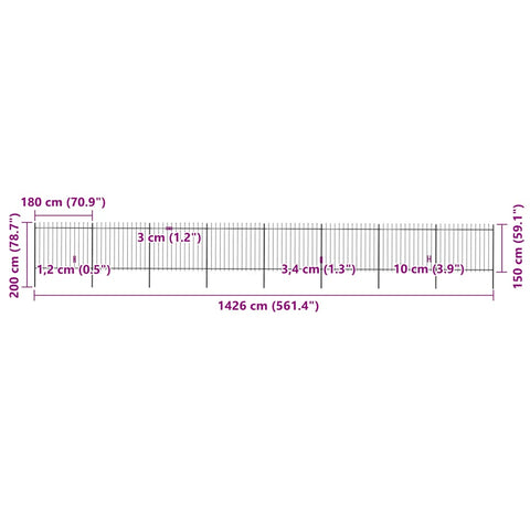 Create an elegant fence around your garden, home, or walkway with our garden fence! Our decorative steel garden fence, consisting of 8 fence panel and 9 posts, has a total length of 13.6 metres. It will form a sturdy, safe and maintenance-free perimeter barrier for your garden, home, or business property. With vertical bars topped with spear ends and strong horizontal brace as reinforcement to the frame, our garden fence will provide a high degree of security. Manufactured from heavy-duty, powder-coated steel, the outdoor fence is exceedingly stable, sturdy and durable. Thanks to the included mounting materials, the garden fence is easy to assemble. Note: You can buy more sets to make the fence as long as you like.