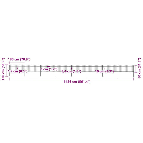 Create an elegant fence around your garden, home, or walkway with our garden fence! Our decorative steel garden fence, consisting of 8 fence panel and 9 posts, has a total length of 13.6 metres. It will form a sturdy, safe and maintenance-free perimeter barrier for your garden, home, or business property. With vertical bars topped with spear ends and strong horizontal brace as reinforcement to the frame, our garden fence will provide a high degree of security. Manufactured from heavy-duty, powder-coated steel, the outdoor fence is exceedingly stable, sturdy and durable. Thanks to the included mounting materials, the garden fence is easy to assemble. Note: You can buy more sets to make the fence as long as you like.