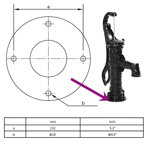 This water pump is totally hand operated, and very easy to use. By moving the handle up and down, water is pumped from the ground and will flow out from the tap. This hand pump can be easily installed. With a cast iron construction, it is robust and highly durable. The pump itself has a 38 mm (1 1/2") female fitting at the bottom, and a PVC pipe or a stainless steel pipe needs to be connected to the fitting (either through a male threaded fitting or with a hose connector) to divert water into the pump. Please note that the delivery includes a pump only; pipes and a stand are not included. Note: We recommend that empty the pump during the winter lest it should freeze inside.