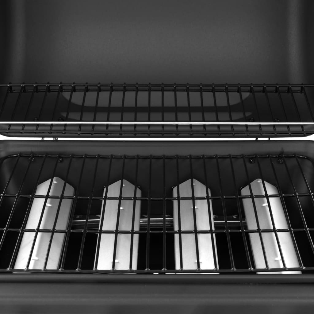 This gas BBQ grill, with 4 burners, is ideal for creating an outdoor feast for your family and friends. It will make your outdoor cooking experience sizzle, effectively turning your backyard into a second kitchen! The gas grill features a stylish and functional design. It has a large cooking surface and a heavy-duty hood with a built-in thermometer which accurately displays the cooking temperature. Side tables offer additional workspace for making sauces or your favourite side dishes. A removable grease drip container is also included, which is easy to clean. Made of heavy-duty materials, the grill is very durable. The shelf underneath provides large space to store cookware and utensils. Thanks to the 2 sturdy castors, the grill is easy to move around. Delivery also includes a BBQ cover to protect the grill from rain and dust. To connect the barbecue to the gas cylinder, a gas hose and a proper pressure regulator are required, which are not included in delivery.