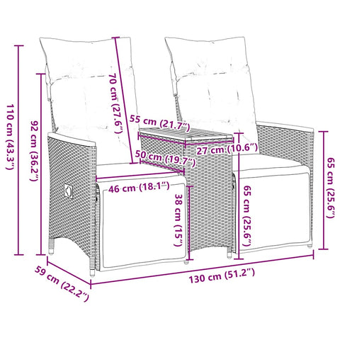 Relax and enjoy the outdoors in this comfortable reclining garden sofa! Durable material: PE rattan, also known as poly rattan, is a strong, low-maintenance synthetic material that looks like natural rattan. It's lightweight, easy to clean, and commonly used for outdoor furniture due to its durability and weather-resistant properties.Convenient central table: This outdoor furniture features an integrated central table, providing a convenient spot to keep your essentials within easy reach.Adjustable backrest and footrest: This garden seat has a handle. You can adjust the backrest and footrest to any position by pulling the handle, and quickly return them to their original positions.Comfortable seat experience: This outdoor furniture, complete with thickly padded cushions, offers a comfortable seating experience.Removable and washable cover: These seat cushions feature removable covers for easy washing and maintenance. Good to know:To make sure your outdoor furniture stays beautiful, we recommend protecting it with a waterproof cover.