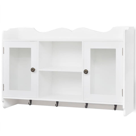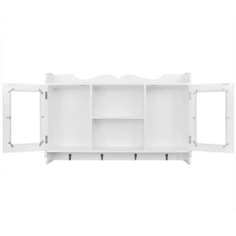 This display cabinet will become the focal point of any room. With an invisible mounting system, the display cabinet is easy to install, and serves as an ideal place to store items like trophies, books, collectables, ornaments, etc. The hanging cabinet is made of high-quality painted MDF. It has two glass panel doors to keep the items inside dust free. With 4 hooks at the bottom of the cabinet, you can hang your coats, bags, caps, keys, etc. This display cabinet will suit any decor and turn an empty wall into a feature!