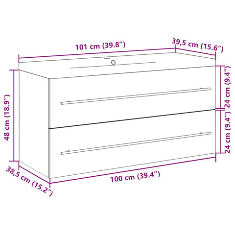This handy bathroom furniture set, featuring spacious storage space, is an excellent addition to your bathroom, giving it a tidy and striking appearance! Long-lasting material: The engineered wood is of exceptional quality with a smooth surface and also features strength, stability and resistance to moisture.Durable material: The bathroom sink, made of ceramic, has a durable surface that resists impacts, stains, and scratches, ensuring its long-lasting shine.Ample storage space: The bathroom cabinet offers ample storage space to easily accommodate your essential toiletries and bath items such as soaps, shampoo, toothpaste, etc.Wall-mounted function: The bathroom furniture can be wall-mounted to add extra storage space. That way, you can maximise your floor space and keep the area clean. Good to know:Screws and plugs for inside the wall are not included. We advise you to find and use screws and plugs suitable specifically for your walls. If you're not sure, you can consult with a professional. Please read and follow each step of the instructions.