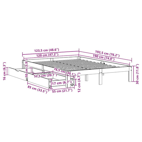 Get a better restful night's sleep from this bed frame! It makes a welcoming addition to any bedroom. Stable and long-lasting frame: Solid pinewood is known for its strength and durability. Its straight grains and distinctive knots contribute to its rustic charm.Slatted base for optimal support: The bed frame is equipped with a slatted base for support and breathability for your mattress.Extra storage space: This bed base features two drawers underneath, providing storage for items like extra bedding, seasonal clothing, and toys.Effortless manoeuvrability: This under-bed storage drawer features four wheels, providing smooth and effortless manoeuvrability for sliding in and out from beneath your bed. Good to know:A mattress is not included with this bed. We do offer a various selection of mattresses. You can check our shop for a matching mattress.