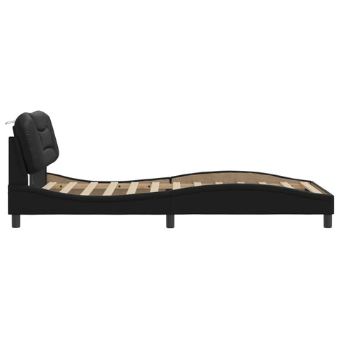 Get a better restful night's sleep from this bed frame with LED lights! It makes a welcoming addition to any bedroom. Durable faux leather: Premium faux leather is a highly durable material. It is resistant to stain, making it easy to clean with a damp cloth. The smooth surface also gives a luxurious look and the beauty of real leather.Plywood slats: The plywood slats provide good weight distribution, ensuring that the mattress stays in place with every twist and turn of your body during sleep.Excellent support: The bed header provides you with excellent back support while you're sitting up in bed to read or watch TV.Colourful LED strip: Bring playfulness into darkness with colourful LED lights! The hook and loop fasteners on the back of the headboard cushion can be used to secure the LED lights.Waved side design: The waved look of the bed frame is stylish and sophisticated, adding a modern and elegant touch to your decor, making it the focal point of your bedroom. Good to know:A mattress is not included with this bed. We do offer a various selection of mattresses. You can check our shop for a matching mattress.The product has a USB connector that requires a certified 5V USB power source (not included).
