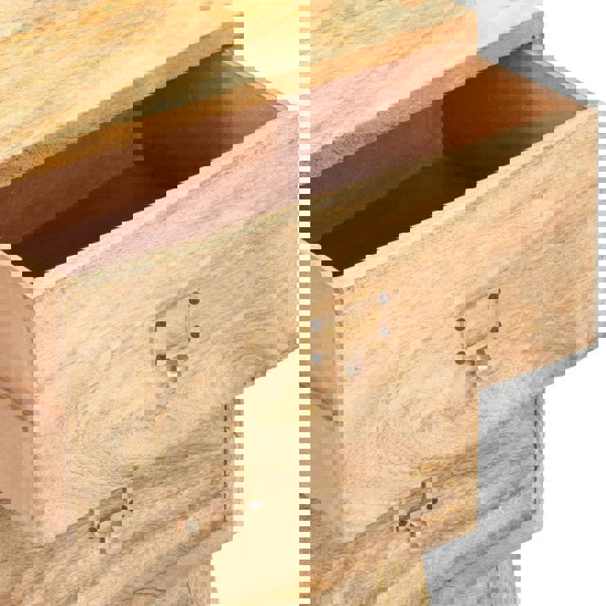 This wooden bedside cabinet will make a decorative as well as practical addition to your decor. The bed cabinet is handmade out of solid mango wood, which makes it sturdy and stable. The craftsmanship and the beautiful wood grains make every piece of furniture unique and slightly different from the next. Additionally, this nightstand has ample storage space for keeping your important items organised and within reach. The end table is also easy to assemble. Important note: Colours and grains may vary from piece to piece, making each piece unique. The delivery is random, ensuring the exclusivity and individuality of your product.