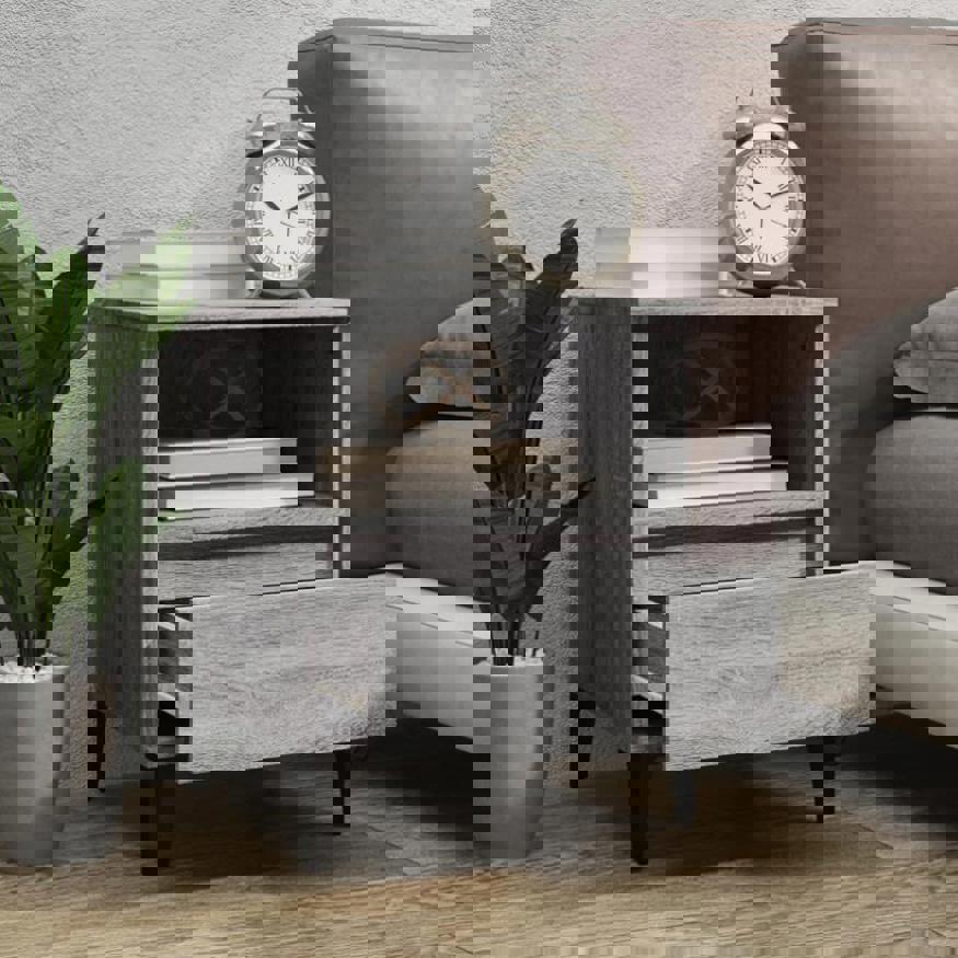 These bedside cabinets with an elegant design make a timeless addition to your interior decor. Durable material: The engineered wood is of exceptional quality with smooth surface and also features strength, stability and resistance to moisture. Ample storage space: The bedside table is designed with a compartment and a drawer to keep things organised and within easy reach. Metal feet: The metal feet add an industrial style to your interior while ensuring stability.Stable and sturdy table top: The top of the side cabinet is perfect for displaying your decorative items, picture frames and potted plants. Note:Each product comes with an assembly manual in the box for easy assembly.