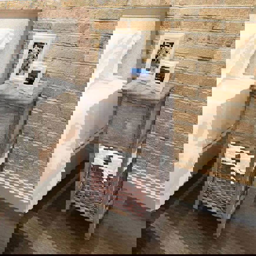 Add a touch of rustic charm to your home with these chic wooden bedside cabinets! They can also be used as telephone stands, side cabinets, small cabinets, drawer cabinets, storage cabinets, nightstands, night cabinets, bedroom cabinets, end tables, end cabinets, etc. These compact cabinets each have a smoothly running drawer, which provides ample space for keeping smaller items organised and within reach. Beneath the drawer, you will find a removable wicker basket for extra storage space. The fabric liner of the baskets can be removed and washed. Delivery includes 2 bedside cabinets.