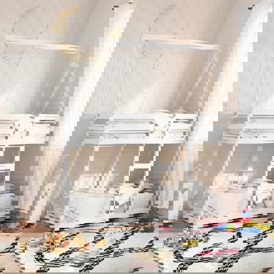 This kids' bunk bed with roof is elegant and functional, making it a perfect addition to any room with limited space. Solid pine wood: Solid pine wood is a beautiful natural material. Pine wood has a straight grain, and the knots give the material its signature, rustic look.Safe design: The loft bed is designed with safety in mind. It features guardrails to keep the user from rolling out while sleeping.Plywood slats: The plywood slats provide good weight distribution, ensuring that the mattress stays in place with every twist and turn of your body during sleep.Great fun: By combining the roof with your child's bed, you can create a hideaway that offers your kid lots of bedtime fun. This innovative addition will not only be a thrilling focal point but will also bring wonder and excitement to the kids' room.Suitable for limited space: The bed frame makes an excellent choice for any room with limited space, it provides two individual beds with compact design.Open side door: The roof features an open side door, providing easy access for your kids to get in and out of bed. Good to know:A mattress is not included with this bed. We do offer a various selection of mattresses. You can check our shop for a matching mattress.