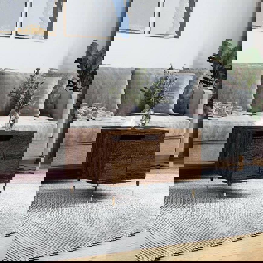 Add a touch of elegance to your living room with this stylish coffee table. Durable material: The engineered wood is of exceptional quality with smooth surface and also features strength, stability and resistance to moisture. Made of engineered wood, the side table is easy to clean with a damp cloth.Ample storage space: This sofa table with a drawer offers ample storage space to keep your essentials well organised and within reach.Sturdy tabletop: The sturdy tabletop is perfect for placing your drinks, food and other decorative items.Metal legs: The metal legs add a modern and calm style to your interior while ensuring stability.