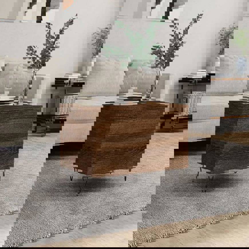 Add a touch of elegance to your living room with this stylish coffee table. Convenient lift-top design: The tabletop of this side table can be smoothly lifted to a comfortable height, converting it to a spot where you can work or dine.Durable material: The engineered wood is of exceptional quality with smooth surface and also features strength, stability and resistance to moisture. Made of engineered wood, the sofa table is easy to clean with a damp cloth.Ample storage space: The hidden storage beneath the rising tabletop makes it easy to keep books or other items organised and within reach, giving sufficient surface for daily necessities, snacks or laptop.Metal legs: The metal legs add a modern and calm style to your interior while ensuring stability.Versatile table: Featuring a unique design, this living room table can serve as a temporary dining table and even a computer desk, which makes it absolutely an excellent investment and addition to any limited space.