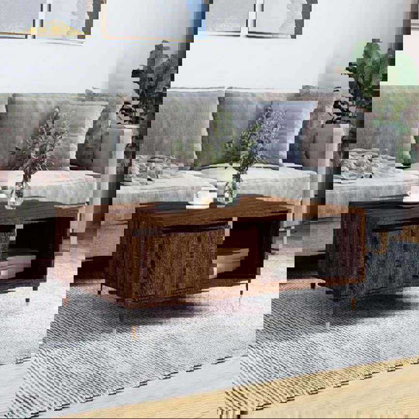 Combining functionality and beauty, this coffee table will be the focal point of your room. Sturdy material: The engineered wood is of exceptional quality with smooth surface and also features strength, stability and resistance to moisture. Made of engineered wood, the side table is easy to clean with a damp cloth.Ample storage space: This sofa table has 2 compartments, offering ample storage space to keep your essentials well-organised and within reach.Stable tabletop: The stable tabletop of the living room table is perfect for placing your books, cups and other decorative items.Iron legs: The iron legs of the couch table ensure sturdiness and stability.