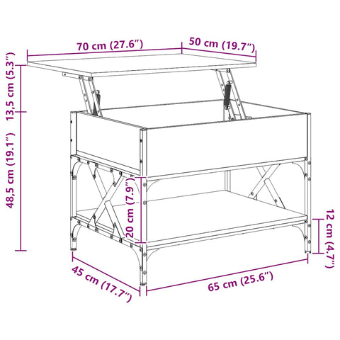 Add a touch of elegance to your living room with this stylish coffee table. Durable material: The engineered wood is of exceptional quality with smooth surface and also features strength, stability and resistance to moisture.Lift-top design: The tabletop of this sofa table can be smoothly lifted to a comfortable height, converting it to a spot where you can work or dine.Ample storage space: The living room table has ample storage space beneath the top for a hidden compartment, so you can store your often-used items and keep them away from dust.Adjustable feet: The centre table is equipped with 4 adjustable feet that can protect your floor from scratches and keep it stable on the uneven floor.Sturdy frame: The metal frame of this couch table ensures sturdiness and stability.