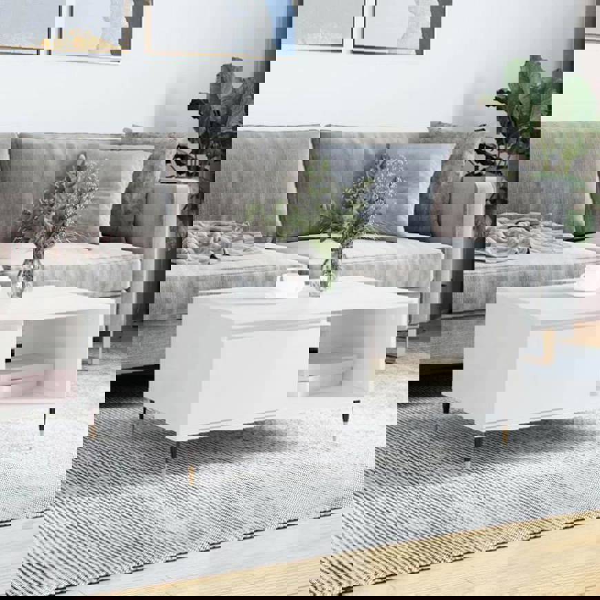 Combining functionality and beauty, this coffee table will be the focal point of your room. Sturdy material: The engineered wood is of exceptional quality with smooth surface and also features strength, stability and resistance to moisture. Made of engineered wood, the side table is easy to clean with a damp cloth.Ample storage space: This sofa table has 2 compartments, offering ample storage space to keep your essentials well-organised and within reach.Stable tabletop: The stable tabletop of the living room table is perfect for placing your books, cups and other decorative items.Iron legs: The iron legs of the couch table ensure sturdiness and stability.
