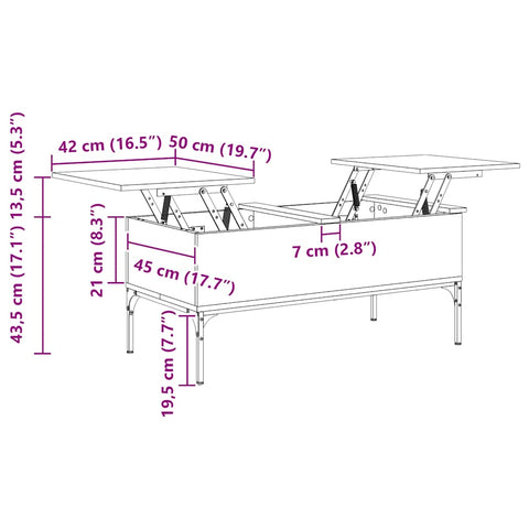 Add a touch of elegance to your living room with this stylish coffee table. Durable material: The engineered wood is of exceptional quality with smooth surface and also features strength, stability and resistance to moisture.Lift-top design: The tabletop of this sofa table can be smoothly lifted to a comfortable height, converting it to a spot where you can work or dine.Ample storage space: The living room table has ample storage space beneath the top for 2 hidden compartments, so you can store your often-used items and keep them away from dust.Adjustable feet: The centre table is equipped with 4 adjustable feet that can protect your floor from scratches and keep it stable on the uneven floor.Sturdy frame: The metal frame of this couch table ensures sturdiness and stability.