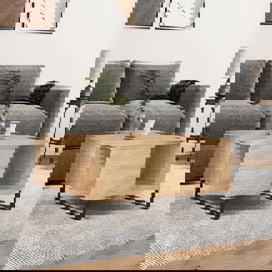 Add a touch of elegance to your living room with this stylish coffee table. Durable material: The engineered wood is of exceptional quality with smooth surface and also features strength, stability and resistance to moisture. Made of engineered wood, the side table is easy to clean with a damp cloth.Ample storage space: This sofa table offers ample storage space to keep your essentials well organised and within reach.Sturdy tabletop: The sturdy tabletop is perfect for placing your drinks, food and other decorative items.Metal legs: The metal legs add a modern and calm style to your interior while ensuring stability.