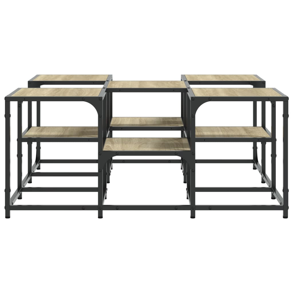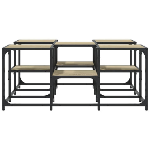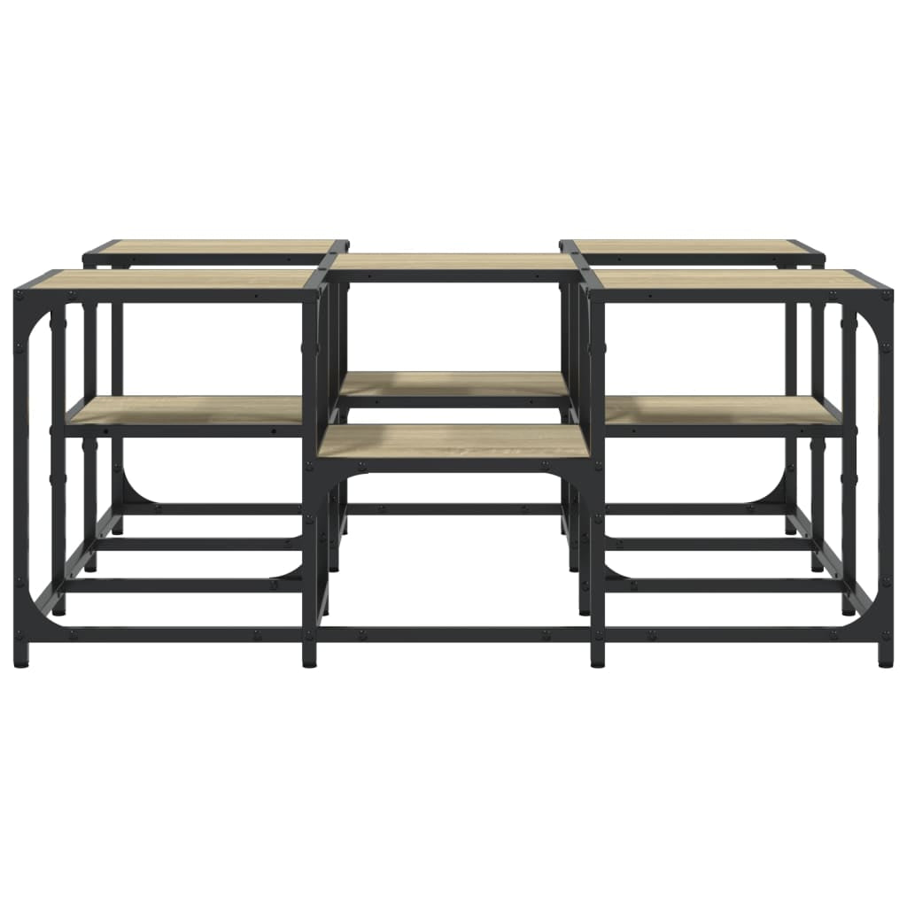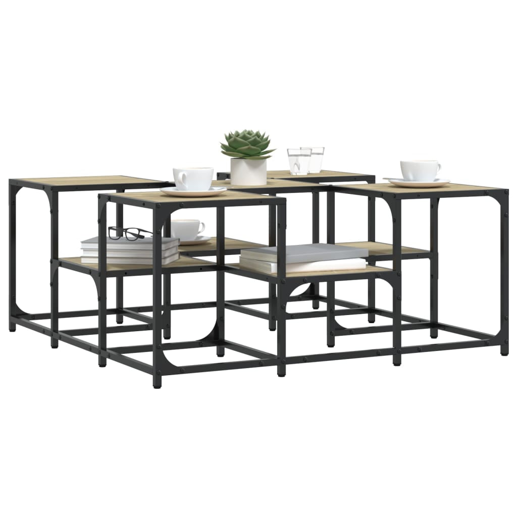 Decorate your living room with this stylish coffee table, it easily blends with furniture in any style at your house. Durable material: The engineered wood is of exceptional quality with smooth surface and also features strength, stability and resistance to moisture. Made of engineered wood, the side table is easy to clean.Sturdy tabletop of 2 heights: This sofa table is designed with 2 tabletop heights for a layered look, offering ample surface space for books, decorative items, and other daily essentials.Adjustable feet: The adjustable feet with plastic pads keep the living room table balanced on uneven ground and increase stability.Metal frame: The metal frame adds an industrial style to your interior while ensuring durability and stability.