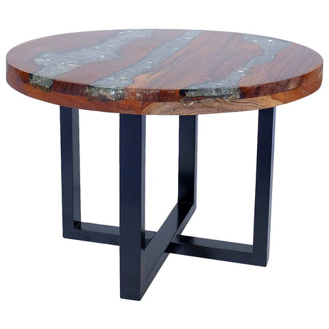 - Tabletop material: Solid teak with a clear lacquer finish + transparent resin with crushed glass