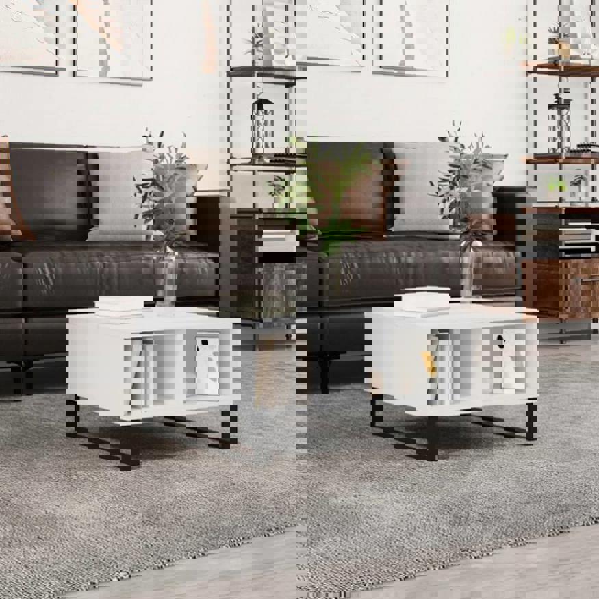 Combining functionality and beauty, this coffee table will be the focal point of your room. Sturdy material: The engineered wood is of exceptional quality with smooth surface and also features strength, stability and resistance to moisture. Made of engineered wood, the side table is easy to clean with a damp cloth.Ample storage space: This sofa table has 4 compartments, offering ample storage space to keep your essentials well-organised and within reach.Stable tabletop: The stable tabletop of the living room table is perfect for placing your books, cups and other decorative items.Iron legs: The iron legs of the couch table ensure sturdiness and stability.