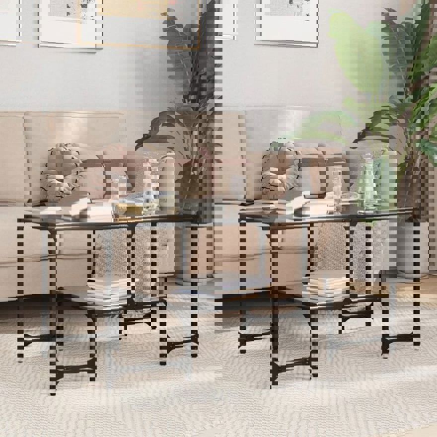 Add a touch of elegance to your living room with this stylish coffee table! Glass top: The top of the side table provides a visible and ample surface to place snacks, drinks, vases, fruit bowls, or other decorative items.Durable material: The engineered wood is of exceptional quality with a smooth surface and features strength, stability and resistance to moisture.Sturdy and stable frame: The stainless steel frame of the living room table ensures sturdiness and stability.Easy maintenance: This coffee table with stain-resistant surface is easy to wipe clean and you can effortlessly keep the table looking its best.Simple design: This sofa table has a simple and modern design that complements any room decor.
