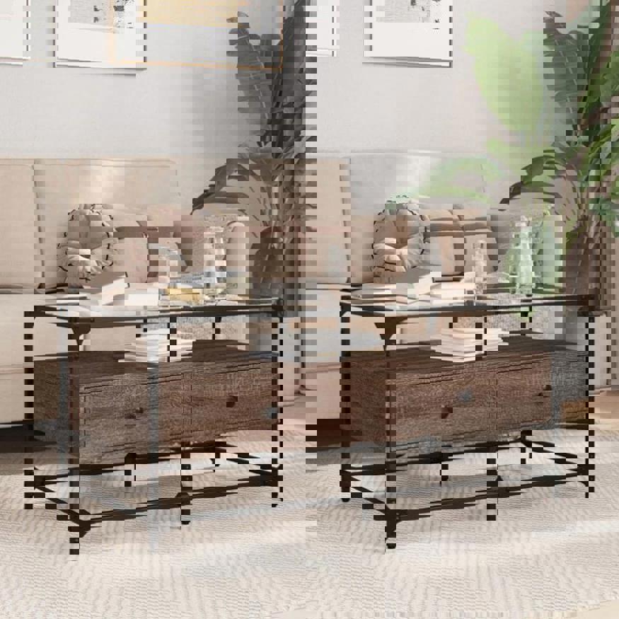 Coffee Table with Glass Top Brown Oak 98.5x50x45 cm Steel 846048