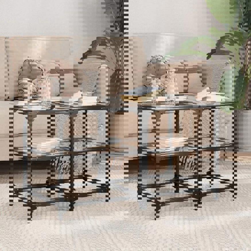 Add a touch of elegance to your living room with these stylish coffee tables! Glass top: The top of the side table provides a visible and ample surface to place snacks, drinks, vases, fruit bowls, or other decorative items.Durable material: The engineered wood is of exceptional quality with a smooth surface and features strength, stability and resistance to moisture.Sturdy and stable frame: The stainless steel frame of the living room table ensures sturdiness and stability.Ample storage space: The side table has spacious storage space, providing ample space for your various storage needs and keeping your things organised.Easy maintenance: This coffee table with stain-resistant surface is easy to wipe clean and you can effortlessly keep the table looking its best.
