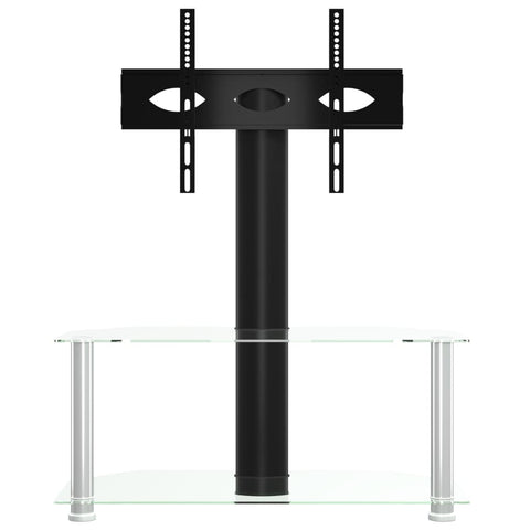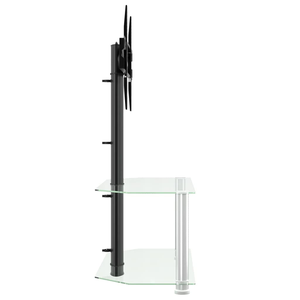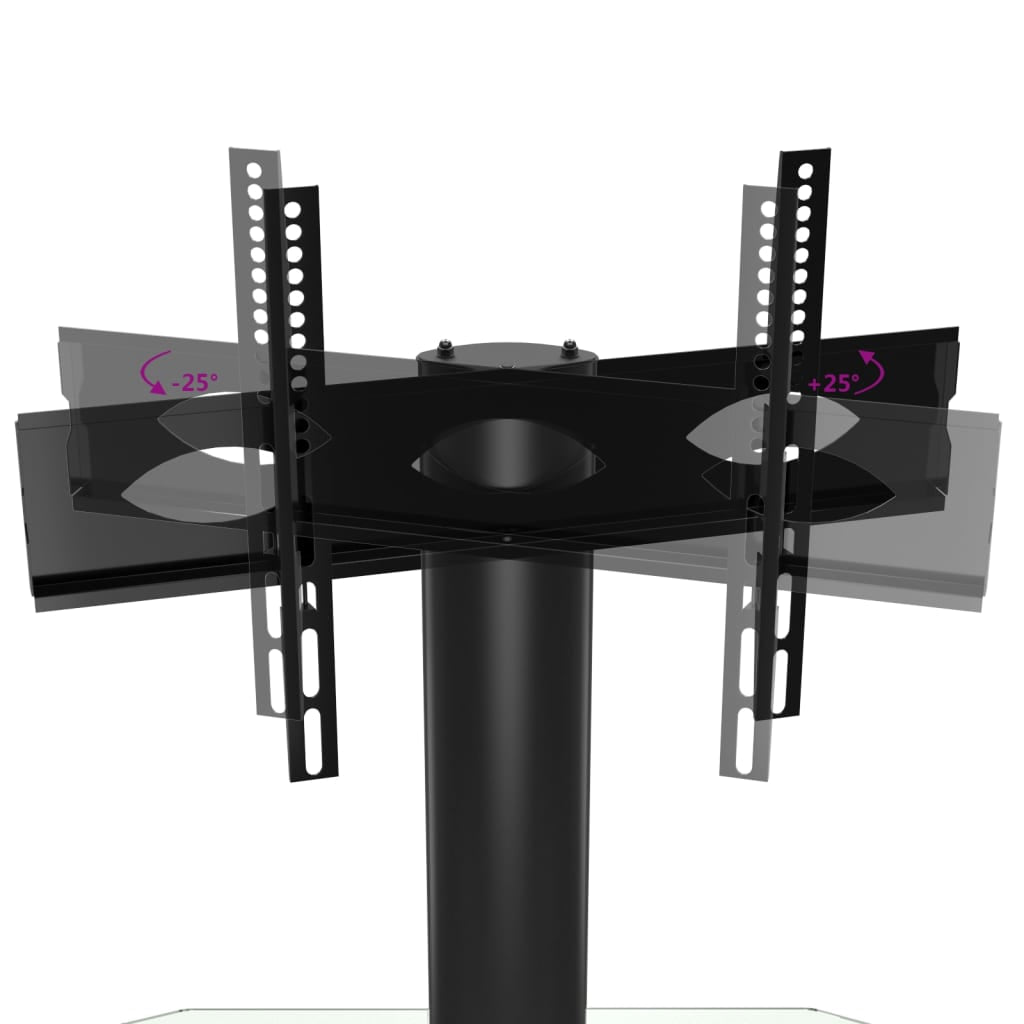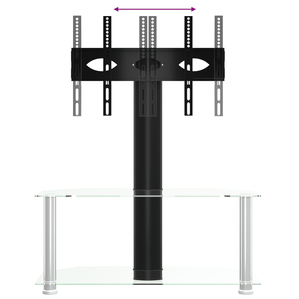 This corner TV stand combines a TV bracket and a 2-tier table in one, offering a practical solution to mount your TV and add extra storage space to your room. Swivelling function: This TV stand can be swivelled 25° left and right to provide you with a better viewing angle.Ample storage space: The media cabinet is designed with shelves, providing ample space to place DVDs, multimedia devices and other decorative items within the load-bearing range.Space saving: This floor TV stand has a compact design and doesn't take up much space, so you can place it in the corner of small living rooms, bedrooms, and offices. Additionally, it has a cable management system to save space and tidy up messy wires at the back of the TV stand cabinet.VESA compatibility: This TV unit is compatible with VESA sizes ranging from 100 x 100 mm to 600 x 400 mm, such as 600x400/400x400/400x300/400x200/200x400/300x300/300x200/200x200/200x100/100x200/100x100 mm. Good to know:Make sure your TV has four threaded mounting holes on the back of the screen. We recommend measuring the VESA hole spacings on your TV before purchasing to ensure compatibility.Make sure the width of your TV fits on the TV stand and that the height from the TV bracket to the top glass table also accommodates your TV.We provide various screws and spacers to fit your TV, but they may not work for all brands. You may need to use the original screws that came with your TV or buy special screws yourself.Warning:To prevent it being overturned, this product must be used with the provided wall attachment device.