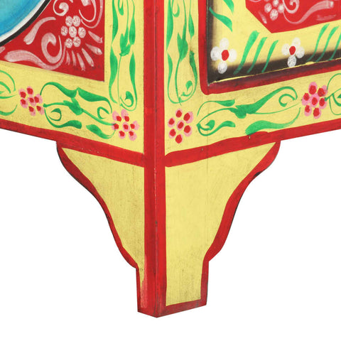 This beautiful wooden bedside cabinet, adorned with rich, hand-painted decorations, will make an eye-catching addition to your bedroom with its colourful design. The nightstand is made from MDF and mango wood which is both durable and beautiful, and the craftsmanship adds to its spectacular retro style. Every step of the process is carried out with the greatest care, be it polishing, painting or lacquering. The bedside table features extensive hand-painted decorative details, which creates a warm and rich effect. This bedside cabinet has a sturdy top, on which you can place a bedside lamp, alarm clock or anything else you might need near your bed. The drawers provide ample space for keeping all kinds of smaller items organised and within reach. The item is already assembled; no assembly is required.