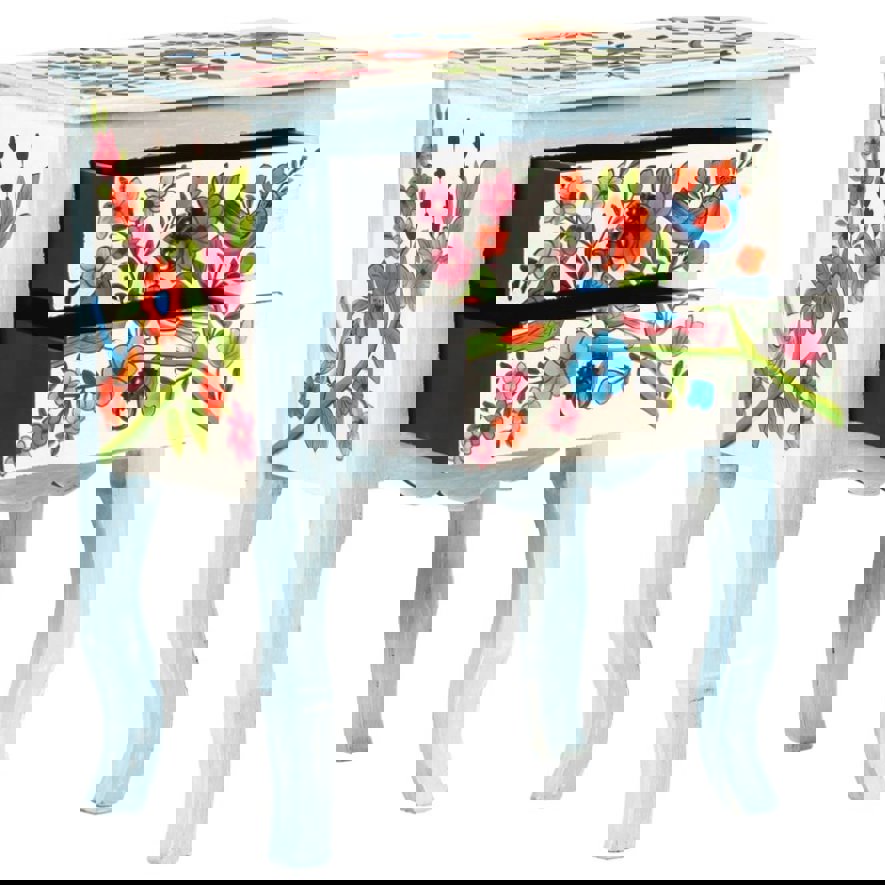 This unique, beautiful wooden bedside cabinet, adorned with rich, hand-painted decorations, makes an eye-catching addition to your bedroom with its colourful design. The nightstand features extensive hand-painted decorative details, which create a warm and cheerful effect. This side cabinet has a sturdy top to place a bedside lamp, alarm clock or anything else you might need near your bed. The two drawers provide ample space for keeping all kinds of smaller items organised and within reach. The bedside stand is made of solid mango wood, a tropical hardwood. It has the strength to bear the weight and also stand the wear and tear of time. Additionally, the exquisite craftsmanship makes every piece slightly different from the next. Important note: The colours vary from piece to piece, making each piece unique. The delivery is random, ensuring the exclusivity and individuality of your product.
