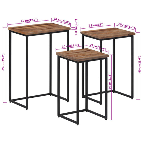 These three nesting coffee tables are a smart solution for small living spaces or any area with limited room. Durable material: Solid teak wood is a beautiful natural material. It has been seasoned, kiln dried and then finely sanded to give a very smooth appearance. Teak wood is known for its exceptional strength and weather resistance.Nesting design: The nest of tables has different sizes to meet your different requirements. The smaller table can nest inside the larger coffee table if you need more room.Sturdy top: The sturdy tabletop of the nesting stand is ideal for placing your drinks or any other necessities you need close at hand.Versatile function: The nesting side tables are versatile! Any one of them can be used as a nightstand in the bedroom, a side table or a couch table in the living room and office.Metal frame: The metal frame adds an industrial style to your interior while ensuring durability and stability.