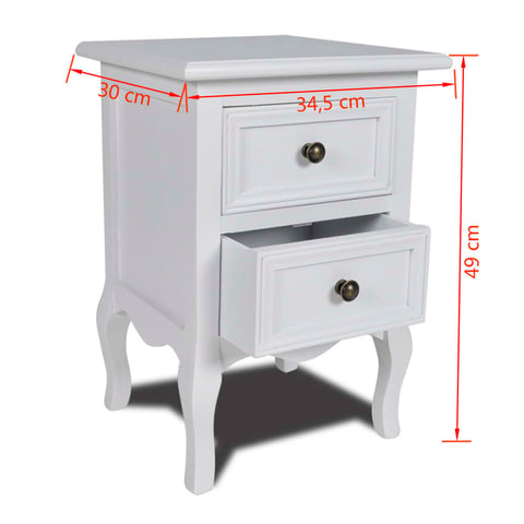 This white nightstand with two drawers will add a touch of style to your bedroom. The painted wood body is solid and perfect for storing and displaying your bedtime essentials, to help keep your room tidy.Since this furniture is hand-crafted, made of wood and painted white, it may come with small imperfections.