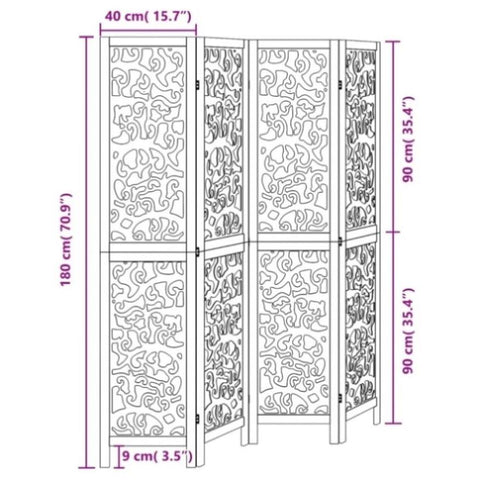 Bring elegance and an eye-catching decorative touch to your space with this charming room divider. Durable and easy to clean: The privacy screen is made from engineered wood, making it easy to clean and durable.Stable frame: The solid paulownia wood frame ensures sturdiness and stability. Solid paulownia wood is a beautiful natural material. Paulownia wood is highly resistant to bugs and rotting.Flexible and easy to fold: Each partition is connected by 3 metal hinges and the upper and lower panels are connected by hidden 2-in-1 hinges. So the room divider panel can be easily folded to some extent according to your needs to save space.Multipurpose: The room partition is great for creating private space in your bedroom, living room, office and other interiors. You can also place it in front of a window to block intense sunlight.Attractive looking: Featuring a delicate openwork looking, this folding room divider adds character and decoration to the space. Warning:Only for indoor use.