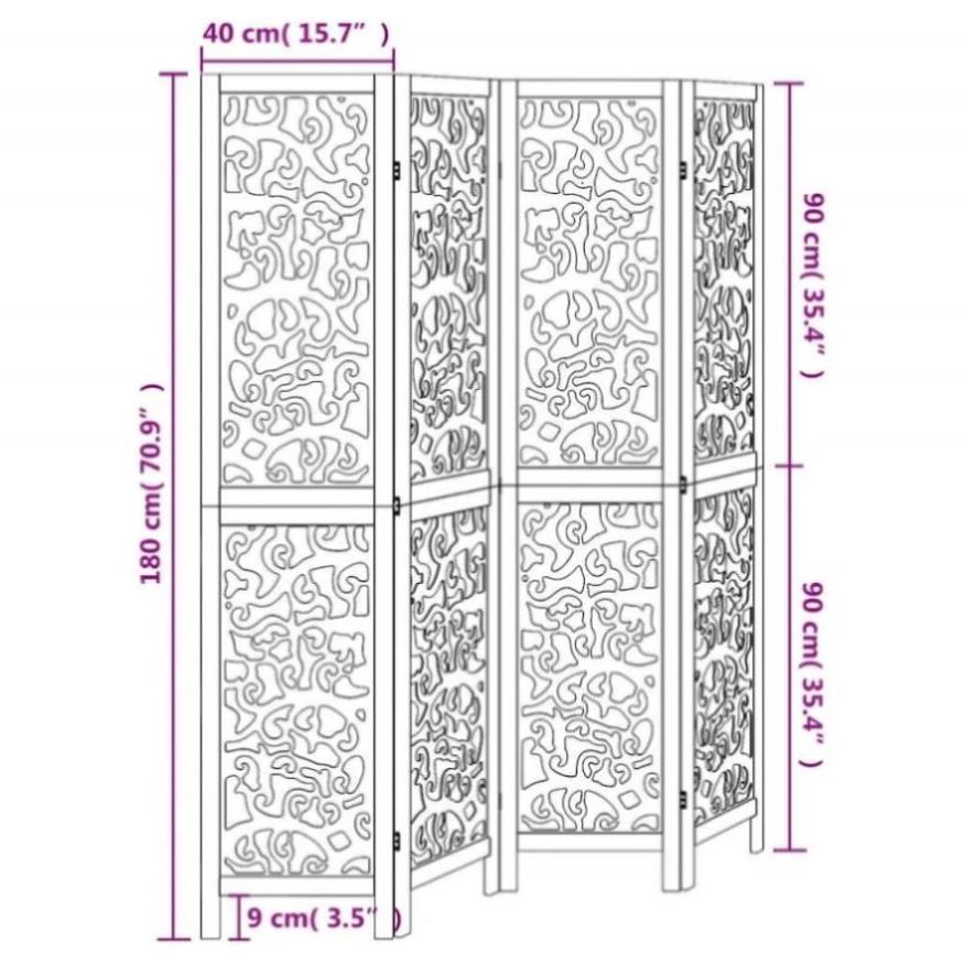 Bring elegance and an eye-catching decorative touch to your space with this charming room divider. Durable and easy to clean: The privacy screen is made from engineered wood, making it easy to clean and durable.Stable frame: The solid paulownia wood frame ensures sturdiness and stability. Solid paulownia wood is a beautiful natural material. Paulownia wood is highly resistant to bugs and rotting.Flexible and easy to fold: Each partition is connected by 3 metal hinges and the upper and lower panels are connected by hidden 2-in-1 hinges. So the room divider panel can be easily folded to some extent according to your needs to save space.Multipurpose: The room partition is great for creating private space in your bedroom, living room, office and other interiors. You can also place it in front of a window to block intense sunlight.Attractive looking: Featuring a delicate openwork looking, this folding room divider adds character and decoration to the space. Warning:Only for indoor use.