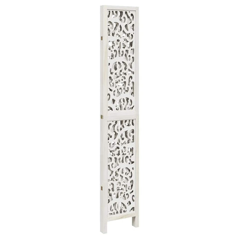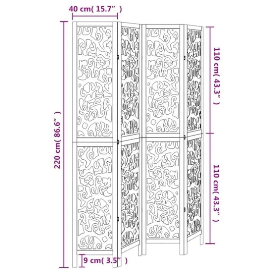 Bring elegance and an eye-catching decorative touch to your space with this charming room divider. Durable and easy to clean: The privacy screen is made from engineered wood, making it easy to clean and durable.Stable frame: The solid paulownia wood frame ensures sturdiness and stability. Solid paulownia wood is a beautiful natural material. Paulownia wood is highly resistant to bugs and rotting.Flexible and easy to fold: Each partition is connected by 3 metal hinges and the upper and lower panels are connected by hidden 2-in-1 hinges. So the room divider panel can be easily folded to some extent according to your needs to save space.Multipurpose: The room partition is great for creating private space in your bedroom, living room, office and other interiors. You can also place it in front of a window to block intense sunlight.Attractive looking: Featuring a delicate openwork looking, this folding room divider adds character and decoration to the space. Warning:Only for indoor use.