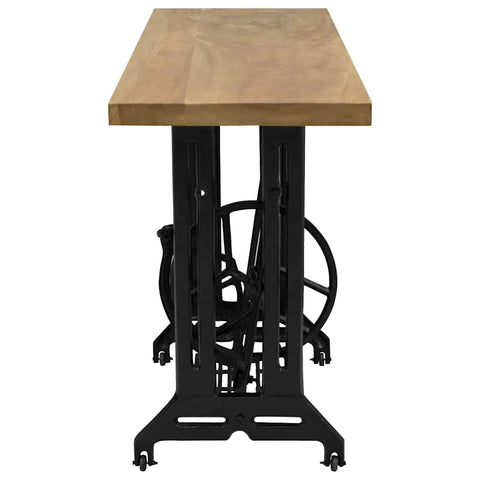 Add a touch of vintage and rustic look to your existing home interior with our sewing machine console table. You can use it as a console table, side table, desk or table under mirror, ect. This furniture is beautifully made using original cast iron base with the sewing machine design and solid suar tabletop with teak wood colour finish, giving it a distinct character. The table ensures high stability and durability. Wide tabletop allows you to place decorative items like fruit baskets or vases or other essentials. Additionally, the pedal of sewing machine is moveable and the wheels could turn around when your foot steps down on it. The console table is easy to assemble.