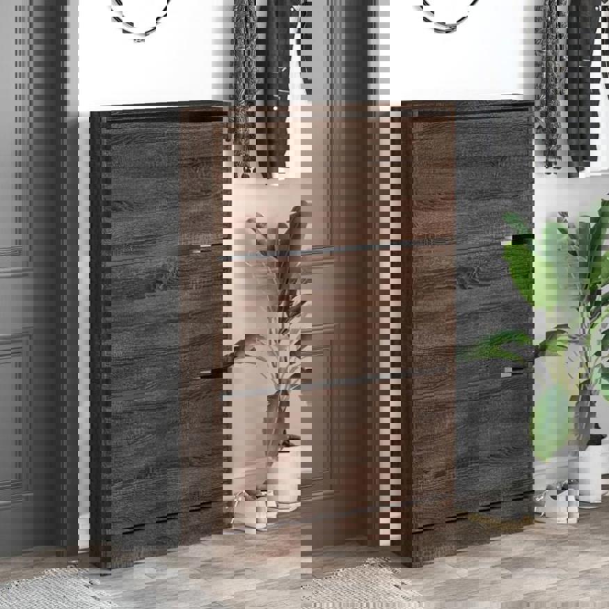 This shoe cabinet is an excellent choice to store your shoes in an organised way, especially for tight and narrow spaces thanks to its compact design. Durable material: The engineered wood is of exceptional quality with a smooth surface and also features strength, stability, and resistance to moisture.Ample storage space: This shoe rack features 3 flip drawers, providing ample space to keep your shoes within reach and well organised.Practical top: The sturdy top of the shoe cupboard is ideal for displaying decorative objects, photo frames, or potted plants.Space-saving design: The slim shoe storage cabinet is designed to perfectly fit small spaces like entryway, hallway, mudroom, etc. Warning:To prevent it from tipping over, this product must be used with the provided wall attachment device.