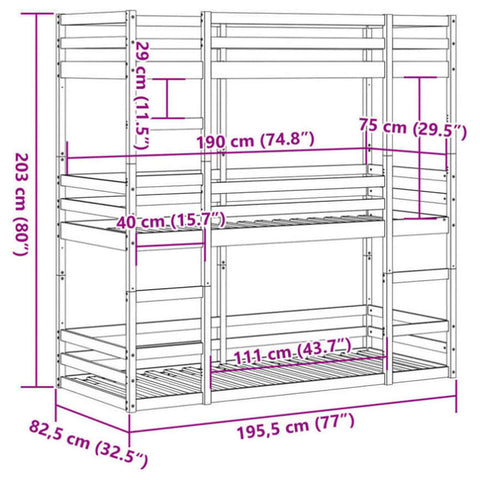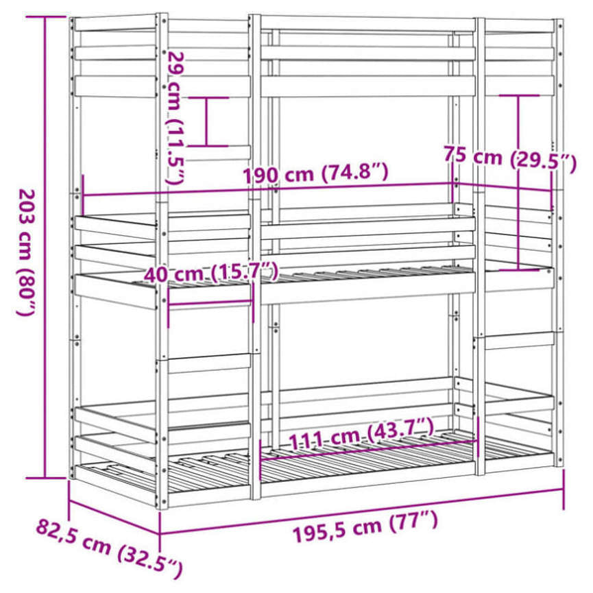 This wooden triple bunk bed is elegant and functional, making it a perfect addition to any room with limited space. Robust and stable: Solid pinewood is known for its strength and durability. Its straight grains and distinctive knots contribute to its rustic charm.Safety guardrails: The triple sleeper comes with safety guardrails on all 4 sides, so you can sleep without worrying about falling off.Practical ladder: The ladder of this bunk bed makes sleeping on the upper floor easier and safer and offers you sufficient safety and stability.Full use of space: This triple sleeper bunk bed uses vertical space efficiently and can be easily converted into separate single and platform beds. Perfect for multi-headed families or spontaneous overnight guests, this triple bed meets versatile sleeping needs. Good to know:The delivery includes bed frames only. The mattresses are not included. You can check our shop for matching mattresses.Screws and plugs for inside the wall are not included. We advise to find and use screws and plugs suitable specifically for your walls. If you're not sure, you can consult with a professional. Please read and follow each step of the instructions.