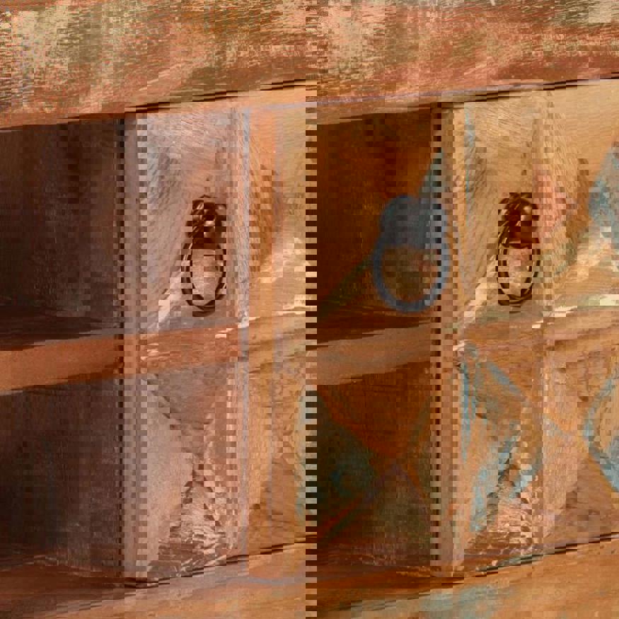 This wooden retro TV cabinet is a practical as well as an eye-catching addition to your interior. Sturdy material: Solid reclaimed wood consists of reused timbers such as teak, mango wood, pinewood, and beech. These materials are recycled from old buildings such as factories, sheds, and boats. As every piece is handmade, colours will vary for each product.Ample storage space: The TV unit features doors and shelves to keep DVD players, game consoles, streaming devices and media carriers within reach and neatly organised.Iron feet: The iron feet of the tv stand ensure sturdiness and stability.Sturdy top: The top of the media cabinet serves as an ideal place to put items such as books and ornaments. Good to know:Each item is unique with variations in colours and grains. The delivery is random, ensuring the exclusivity and individuality of your product.