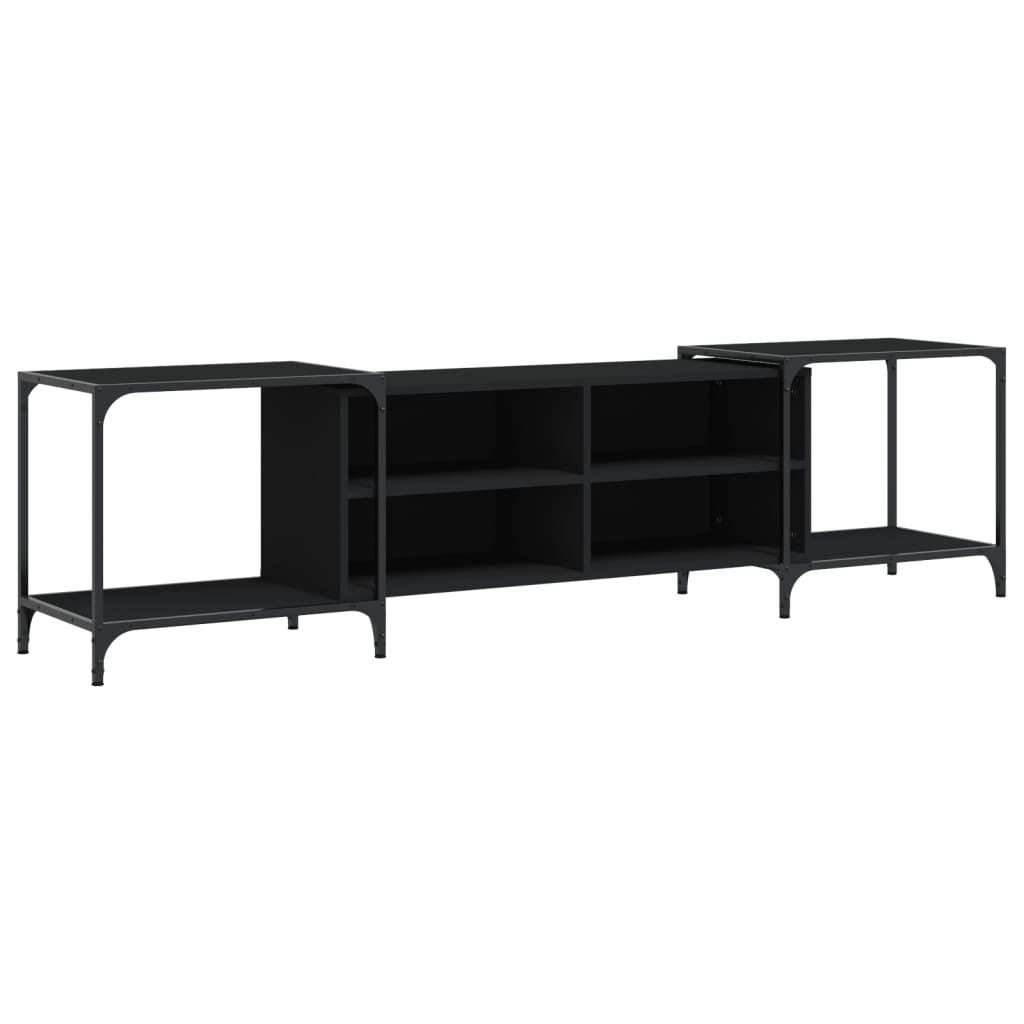 This trendy TV cabinet, featuring a sleek and stylish design, is meant to be a decorative as well as practical addition to your room decor. Durable material: The engineered wood is of exceptional quality with smooth surface and also features strength, stability and resistance to moisture. Made of engineered wood, the TV stand is easy to clean.Ample storage space: The TV unit with shelves offers sufficient storage space to keep your essentials well organised and within reach.Adjustable design: The TV console is adjustable in width as per your needs. Also, the adjustable feet with plastic pads keep the media cabinet balanced on uneven ground and increase stability.Displaying function: The sturdy top of this TV sideboard is a perfect spot for displaying potted plants, framed photos and other decorative items.Metal frame: The metal frame adds an industrial style to your interior while ensuring durability and stability. Warning:To prevent it being overturned, this product must be used with the provided wall attachment device.