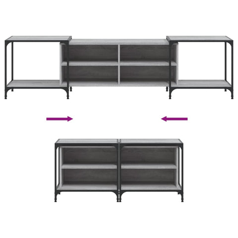 This trendy TV cabinet, featuring a sleek and stylish design, is meant to be a decorative as well as practical addition to your room decor. Durable material: The engineered wood is of exceptional quality with smooth surface and also features strength, stability and resistance to moisture. Made of engineered wood, the TV stand is easy to clean.Ample storage space: The TV unit with shelves offers sufficient storage space to keep your essentials well organised and within reach.Adjustable design: The TV console is adjustable in width as per your needs. Also, the adjustable feet with plastic pads keep the media cabinet balanced on uneven ground and increase stability.Displaying function: The sturdy top of this TV sideboard is a perfect spot for displaying potted plants, framed photos and other decorative items.Metal frame: The metal frame adds an industrial style to your interior while ensuring durability and stability. Warning:To prevent it being overturned, this product must be used with the provided wall attachment device.