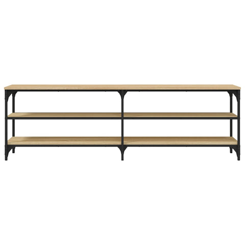 This TV cabinet with industrial design adds a vintage touch to your room! Durable material: The engineered wood is of exceptional quality with a smooth surface and also features strength, stability, and resistance to moisture.Open storage shelves: The TV stand has 3 open shelves, which are perfect for placing receivers, DVDs and game consoles.Stable frame: The iron frame of the lowboard ensures sturdiness and stability.Adjustable feet: The TV cabinet is equipped with 4 adjustable feet that can protect your floor from scratches and keep it stable on a slightly uneven floor.Displaying function: The sturdy top of the TV unit is ideal for displaying decorative items like photo frames and plants. Warning:To prevent it being overturned, this product must be used with the provided wall attachment device.