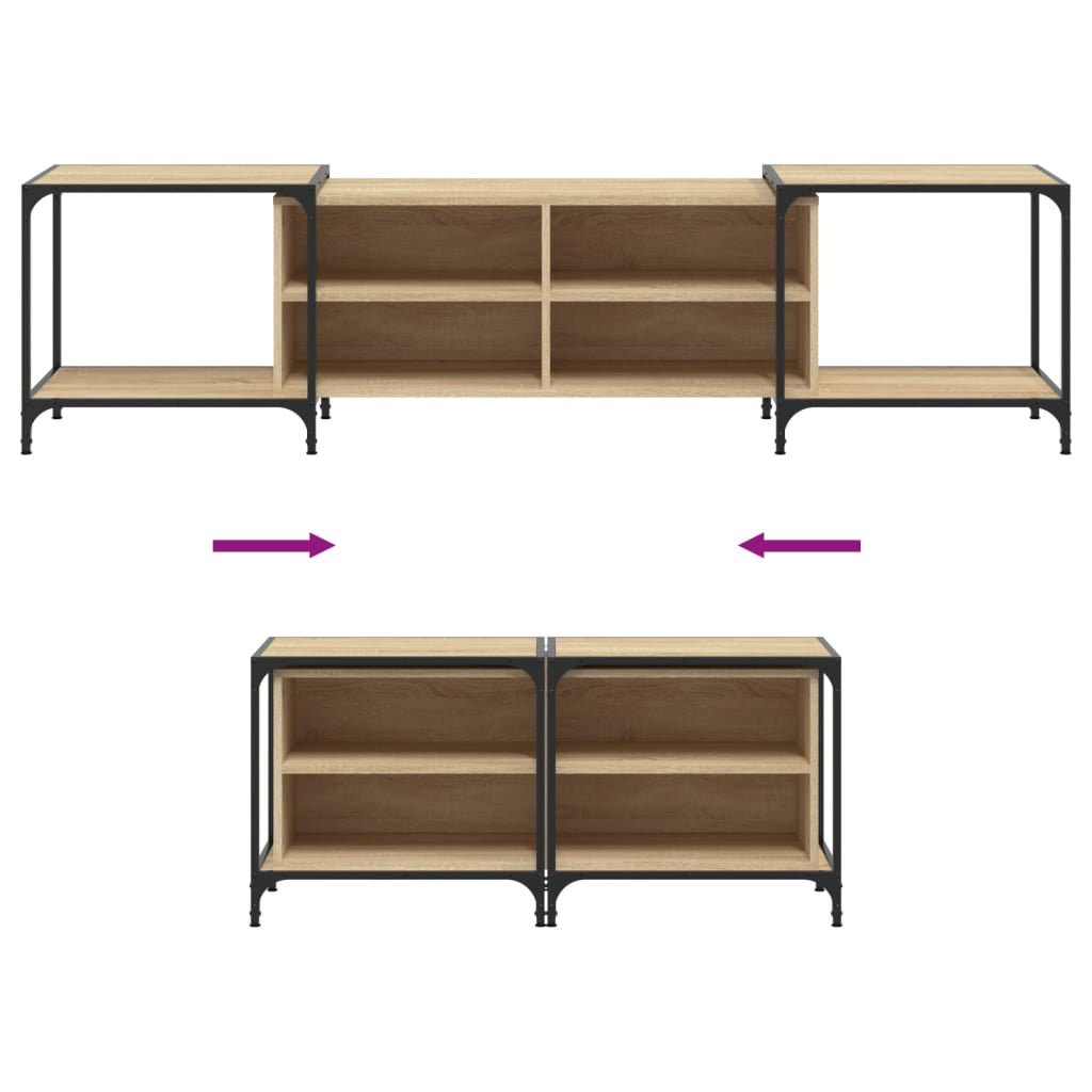 This trendy TV cabinet, featuring a sleek and stylish design, is meant to be a decorative as well as practical addition to your room decor. Durable material: The engineered wood is of exceptional quality with smooth surface and also features strength, stability and resistance to moisture. Made of engineered wood, the TV stand is easy to clean.Ample storage space: The TV unit with shelves offers sufficient storage space to keep your essentials well organised and within reach.Adjustable design: The TV console is adjustable in width as per your needs. Also, the adjustable feet with plastic pads keep the media cabinet balanced on uneven ground and increase stability.Displaying function: The sturdy top of this TV sideboard is a perfect spot for displaying potted plants, framed photos and other decorative items.Metal frame: The metal frame adds an industrial style to your interior while ensuring durability and stability. Warning:To prevent it being overturned, this product must be used with the provided wall attachment device.